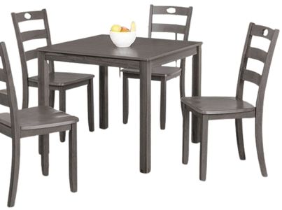 This 5-piece dining set offers a comfortable space for meals and gatherings. It includes a square table and three matching stools, all finished in gray for a versatile look. Built for everyday use, it provides both durability and functionality in any dining area.Read More