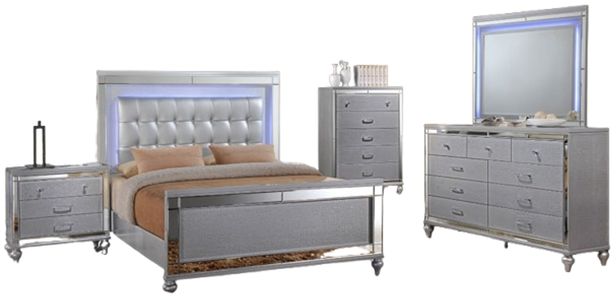 Set include queen lighted bed, dresser and mirror, nightstand, chest