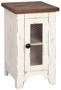 Double take. Sporting a two-tone finish that pairs a distressed vintage white with aged natural pine color, the Westfield tables elevates the art of rustic farmhouse living. Enhancing its charm: shelved storage visible through the cabinet door with inset metal grill.Read More