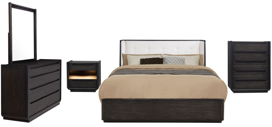 Bedroom set finished in burnished black for a grounded, contemporary aesthetic