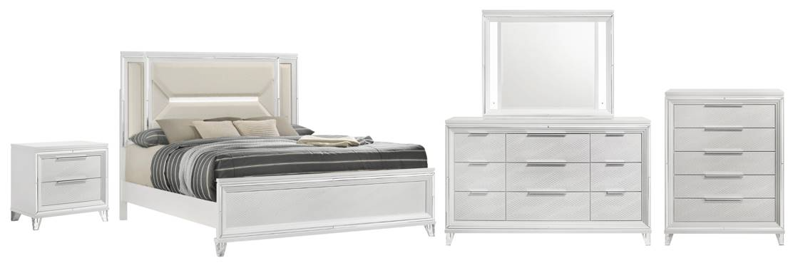 This 5-piece bedroom set features a clean white finish with a queen-sized bed. It combines modern design with functional storage options, offering a bright and elegant look that enhances any bedroom space with style and practicality.Read More