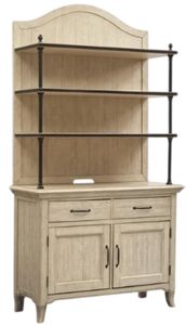 Adding to the designer look of the collection are style elements such as Antique Bronze-finished metal accents on key pieces including the bases of the round and rectangular dining tables, giving the ambience of a bistro cafe. The upholstered dining arm chairs have deconstructed-inspired exposed wood backs, and the highback dining bench has an upholstered seat and back with flared wood legs and nail head decoration. Antique Bronze knob and pull hardware is the perfect complement to the shaped cases and neutral finish. Whether you love classic traditional, European country or rustic chic, you will love coming home to Harlow.